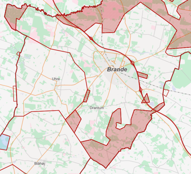 Kort over Brande Vandværks forsyningsområde.